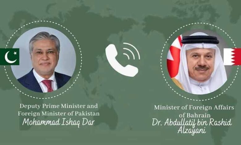 This gratitude was conveyed during a phone call on Saturday between Bahrain’s Foreign Minister Dr. Abdullatif bin Rashid Al Zayani and Deputy Prime Minister and Foreign Minister Ishaq Dar.