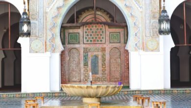 The wooden anaza (outdoor mihrab) and fountain at the courtyard entrance to the prayer hall at Al-Karaouine University (Al-Qarawiyyin) in…