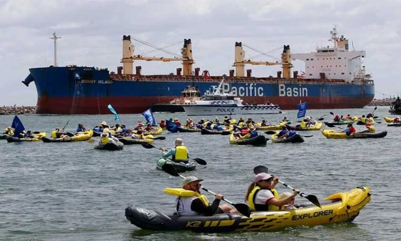 Greenpeace Australia Pacific reported that three of its activists ascended a coal ship at the port, halting its operations as part of a “peaceful protest.”