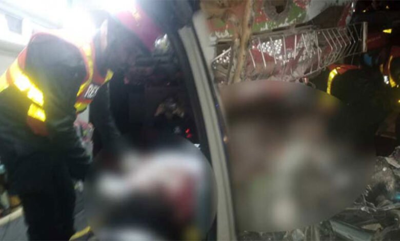Details show that five people were instantly killed when a carelessly driven bus struck a car parked on Pasrur Road in Sialkot at the Lakhanpur Stop.
