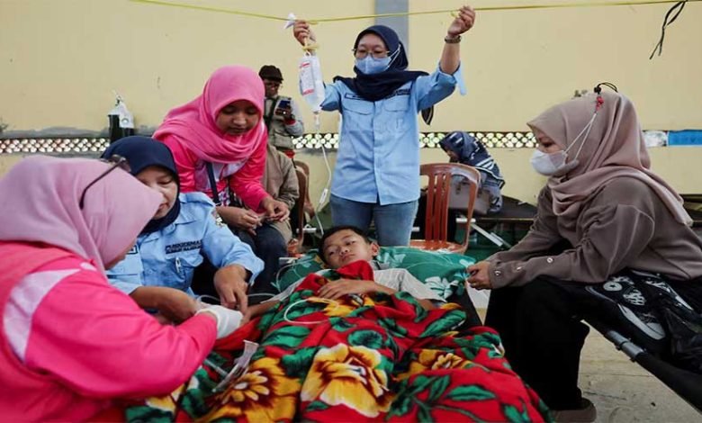 Kompas TV, a local station, aired images from a sports hall in West Bandung repurposed as an improvised treatment clinic, with numerous ill students on fold-out beds, while others lay on the floor in distress.