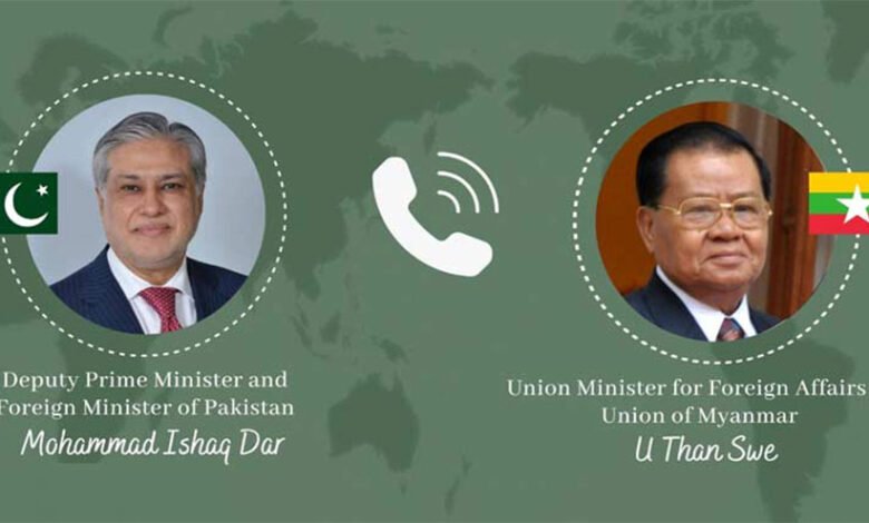 On Tuesday, U Than Swe, the foreign minister of Myanmar, spoke with Senator Mohammad Ishaq Dar, the deputy prime minister and foreign minister.
