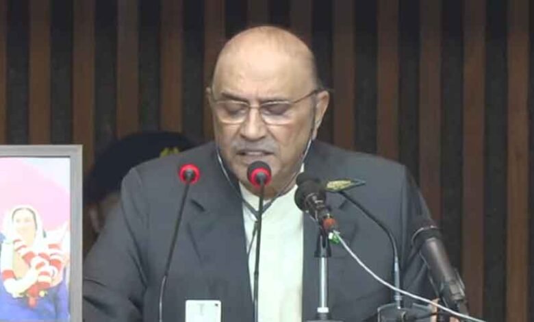 The high-profile aspect of the annual parliamentary address as Pakistan deals with growing regional and economic strains was highlighted by the attendance of province chief ministers and governors, senior MPs, and foreign ambassadors.Addressing a joint session of Parliament on Monday that was marred by protests from the opposition, President Asif Ali Zardari said that Pakistan would not permit any foreign or domestic group to utilize neighboring territory to threaten its peace.