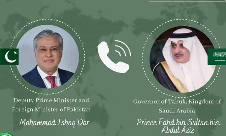 Ishaq Dar, the deputy prime minister and foreign minister, and Prince Fahd bin Sultan bin Abdul Aziz, the governor of Tabuk, Saudi Arabia, both stated a wish to increase collaboration between Pakistan and Saudi Arabia in areas of shared interest.